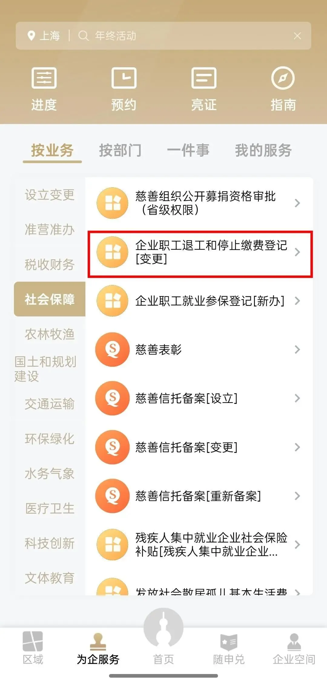 “随申办企业云”APP,企业用户登录后,点击“为企服务”,在“社会保障”栏目点击“企业职工退工和停止缴费登记[变更]”。