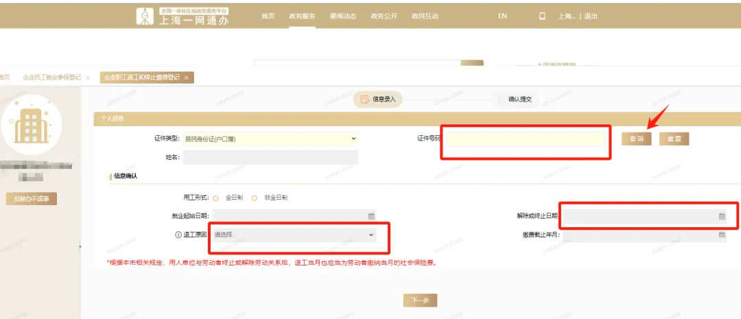 进入页面后,填写证件号码点击查询,信息确认栏红框项将变为可选,按实际选择退工原因和日期即可